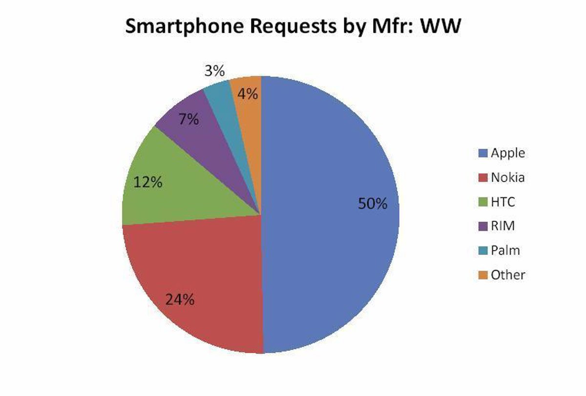 Los terminales de la compañía Apple, iPhone e iPod Touch, llegan a ocupar un 50% de las conexiones que se realizan desde teléfonos inteligentes. Es la principal conclusión del estudio compañía de publicidad móvil AdMob sobre el tráfico de datos en Internet de los terminales móviles.