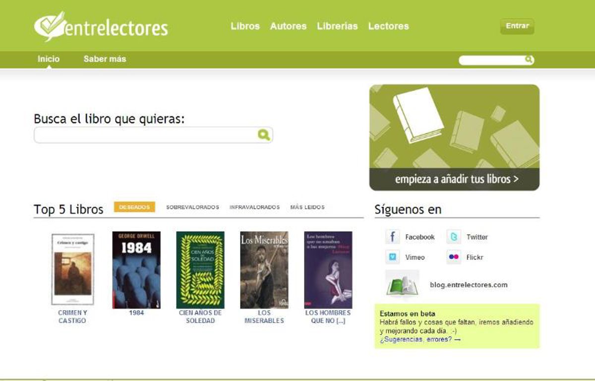 La red social 'Entrelectores' pone en contacto a lectores con autores, librerías, bibliotecas y editoriales. Esta iniciativa, en la que participan Evoluziona, Dosdoce.com, Nervia, Ediciona y Gavilán Digital, nace con 8.000 usuarios registrados y más de 20.000 fichas y recomendaciones de todo tipo de libros realizadas por los propios lectores.