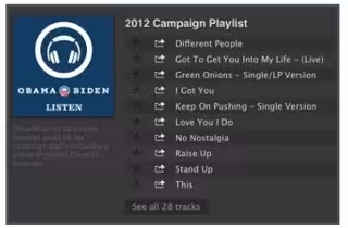 Según se describe en la lista "Campaña 2012", entre estos temas se incluyen algunos de los temas favoritos del presidente Obama. Entre las 28 canciones, destacan Even Better Than The Real Thing de U2, Different People de No Doubt, Everyday America de Sugarland o The Best Thing About Me Is You Feat de Ricky Martin, entre otras.