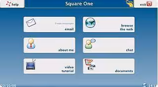 La 'SimplicITy' no abre con una pantalla de inicio y no contiene menús desplegables cuando se le enciende presenta una página que contiene los seis botones separados a los que se puede hacer click para entrar al correo electrónico, navegar por internet, acceder a archivos, salas de chateo en línea y un perfil del usuario.