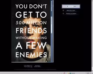 Los dos únicos avances de la película sobre Facebook que se han podido ver a través de dos 'teasers' en los que poco se puede muestra del metraje pero que da cierta idea de cómo tratará el guión de Aaron Sorkin ('El Ala Oeste', 'Studio 60', 'Algunos hombres buenos') la figura del CEO de Facebook. Su frase promocional es también evidente: "No haces 500 millones de amigos sin hacer algunos enemigos".