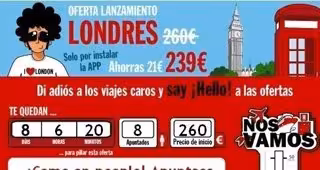 Bajo el lema 'Di adiós a los viajes caros y say ¡Hello! A las ofertas' la ciudad elegida para arrancar esta nueva aplicación es Londres con un precio de salida de 260 euros por persona y un descuento a la hora de instalarse la aplicación de 21 euros.