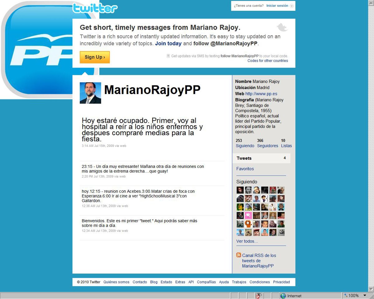Mientras, en otro perfil falso ('http://twitter.com/MarianoRajoyPP'), un supuesto Rajoy da la bienvenida con un primer 'tweet' escrito el 13 de julio el que puede leerse: "Bienvenidos. Aquí podrás saber más sobre mi día a día". Asimismo, acompaña este comienzo con otras frases en las que ironiza con la actividad de Rajoy junto a otros políticos de su partido como Esperanza Aguirre o Alberto Ruiz Gallardón.