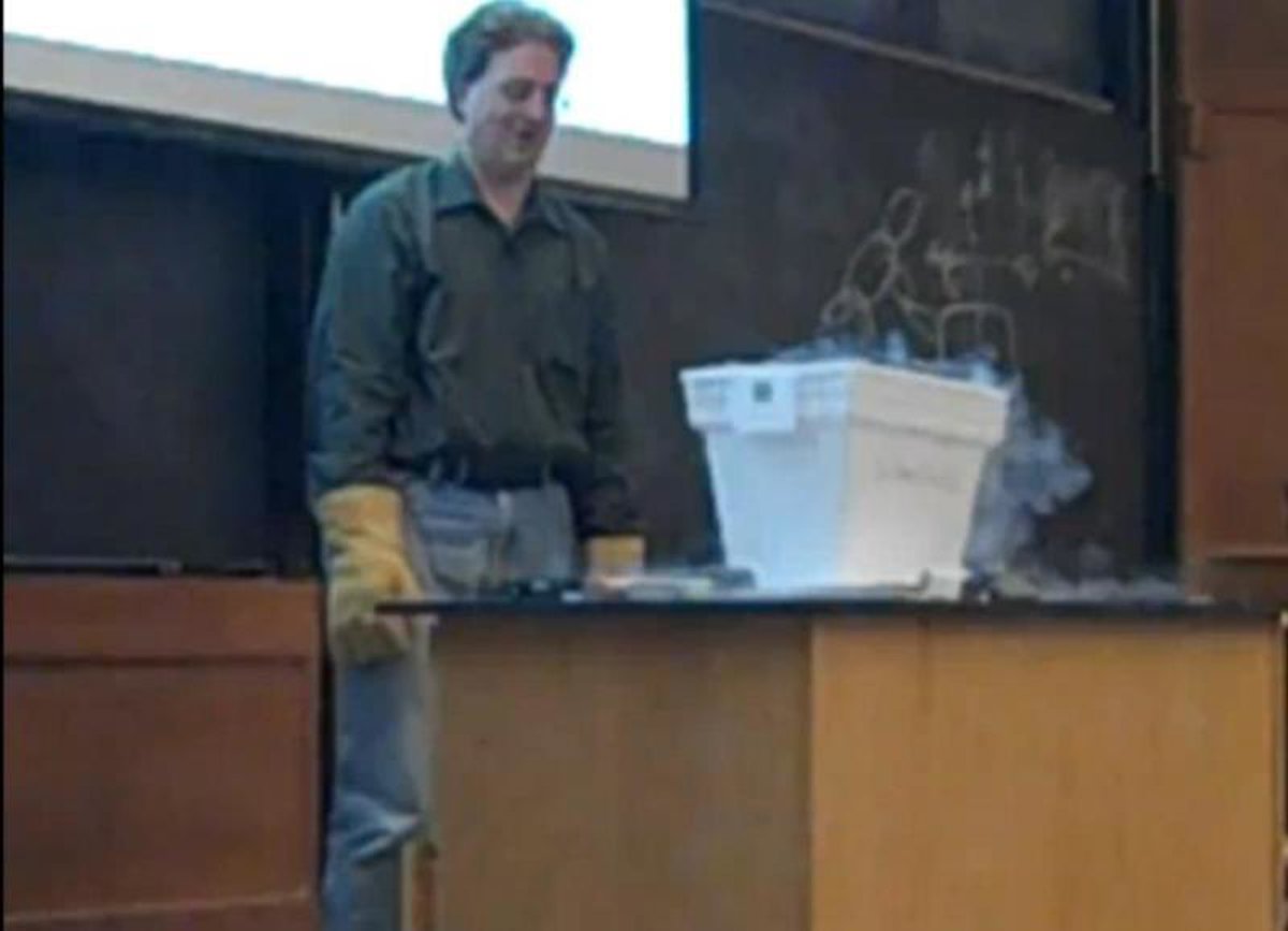 No obstante, en la descripción del vídeo hecha por uno de sus alumnos, aclara el contexto de la escena: el ordenador ya no funcionaba antes de que el profesor decidiese arrojar sobre él nitrógeno líquido.