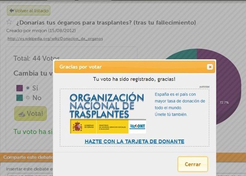 Al votar, los usuarios recibían publicidad de la web de la Organización Nacional de Trasplantes donde hacerse donantes. "Todo el mundo siente la suficiente pasión por algo como para molestarse en hacer 2 clicks para expresar su opinión a través de su voto. Esta pasión es la que usa Quoners para ayudar a los anunciantes a mejorar el click through y a obtener un mayor retorno de su inversión en marketing.Al mostrar la publicidad solo a quien ha demostrado con su voto que ese asunto le interesa, es más probable que se clique en la publicidad, de forma similar a como sucede cuando buscas algo en Google." señala, el socio fundador de Quoners España, Óscar Serra.