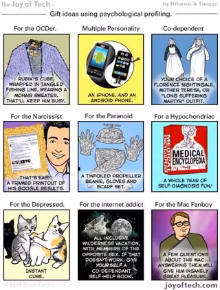 El cómic muestra nueve tipos de personalidades y un regalo perfecto para cada una de ellas. Para aquellos con trastorno obsesivo compulsivo se recomienda un cubo de Rubrik envuelto en hilo de pescar además de un jersey de mohair, para "mantenerlos ocupados un rato".