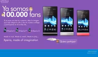 Sony Mobile España ha alcanzado los 100.000 'fans' en su página de Facebook y para celebrarlo regalará cinco Xperia S, cinco Xperia P y cinco Xperia U entre todos los que participen en hacer un mural de fotografías para la imagen de portada de su 'fanpage'.