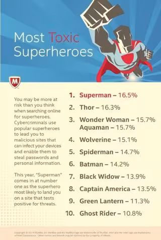McAfee ha publicado los resultados del estudio Los superhéroes más tóxicos, por el que determinadas búsquedas relacionadas con superhéroes llevan directamente a un sitio web que presenta amenazas 'online'. La lista de los más peligrosos la encabeza Superman, con un 16,5 por ciento de posibilidades.