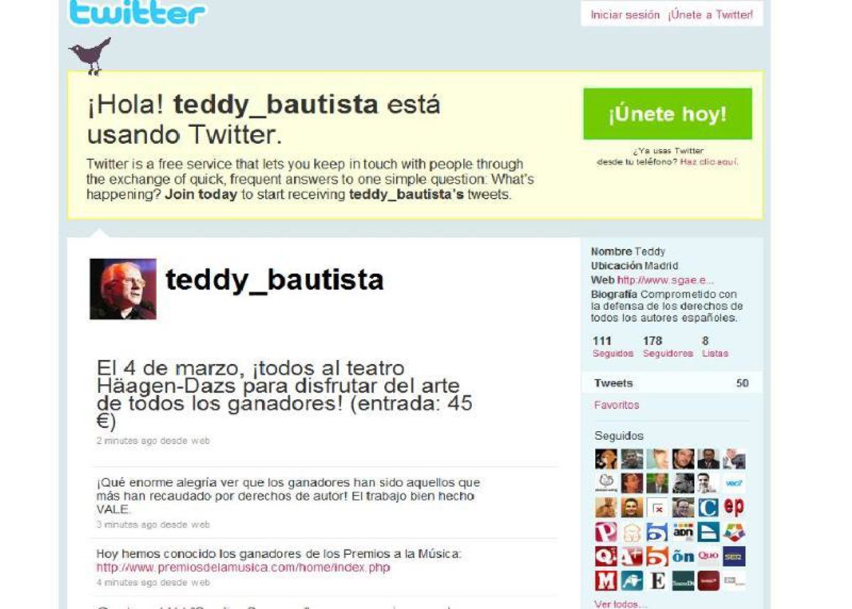 Tras estar tres días activa, la cuenta en Twitter del suplantador de identidad del presidente de la SGAE, Teddy Bautista, ha sido eliminada debido a su "actividad extraña", según aparece en la dirección web de este sitio.