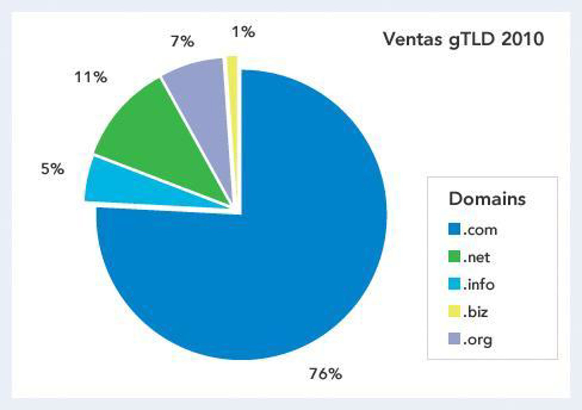 En dominios genéricos, la terminación '.com' sigue siendo la reina entre las terminaciones de primer nivel. Durante el cuarto trimestre de 2009 el 72% de las ventas correspondieron a dominios '.com', porcentaje que aumenta en este primer trimestre de 2010 a un 76%. En cuanto a su precio, éste se mantuvo estable con 1.700? (Trimestre anterior: 1.773?).