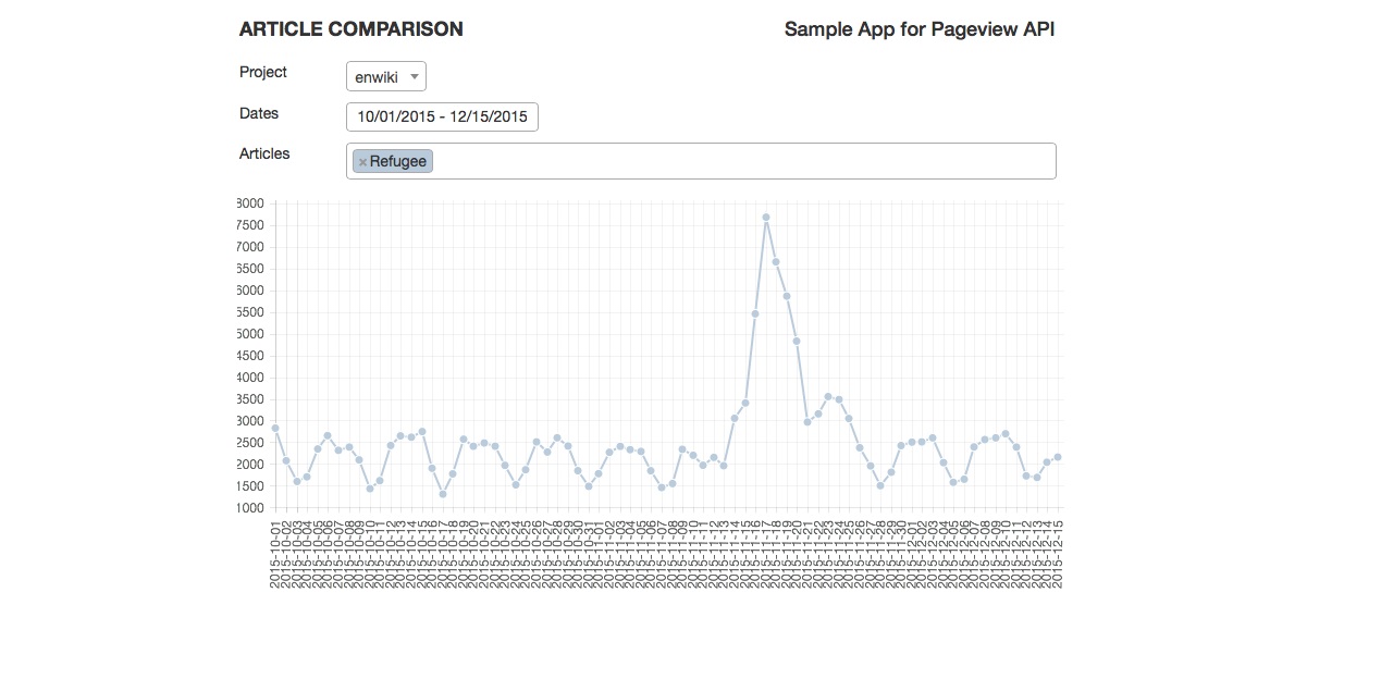 Además, pone a disposición una herramienta que permite conocer cómo ha evolucionado la búsqueda de un término a lo largo del año. Por ejemplo, si introducimos la palabra 'refugee' (refugiado), vemos cómo se produjeron los picos de visitas a los artículos se produjeron en noviembre.