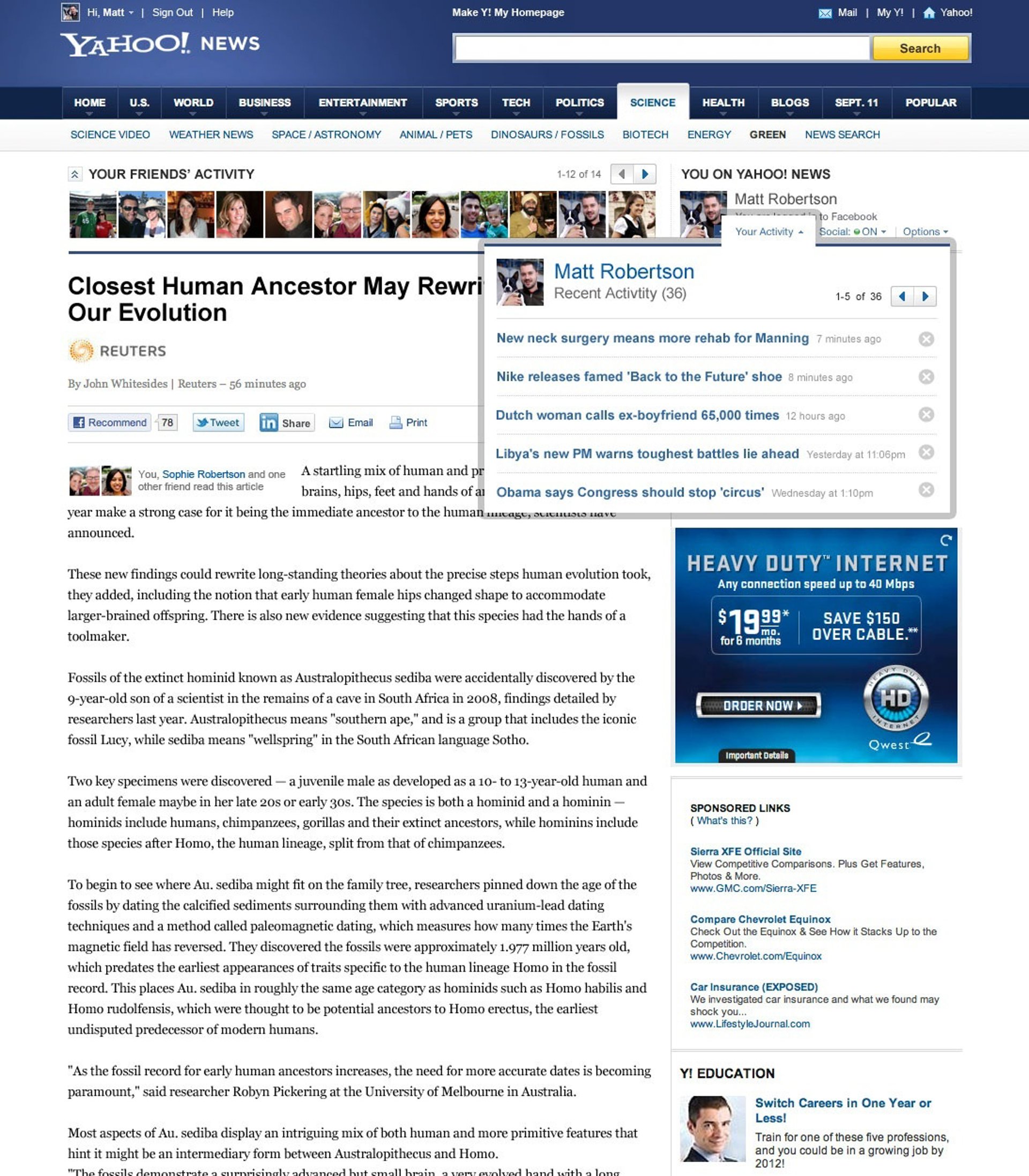 Conectando esta funcionalidad con Facebook, los usuarios pueden ver a sus contactos de Facebook y las noticias que han leído recientemente gracias al nuevo protocolo 'open graph' de Facebook y su 'timeline'. La actividad que ellos mismos tengan, también se verá reflejada automáticamente en Facebook. Aunque se puede conectar y desconectar "fácilmente y borrar los elementos que quiera", ha informado Yahoo!.