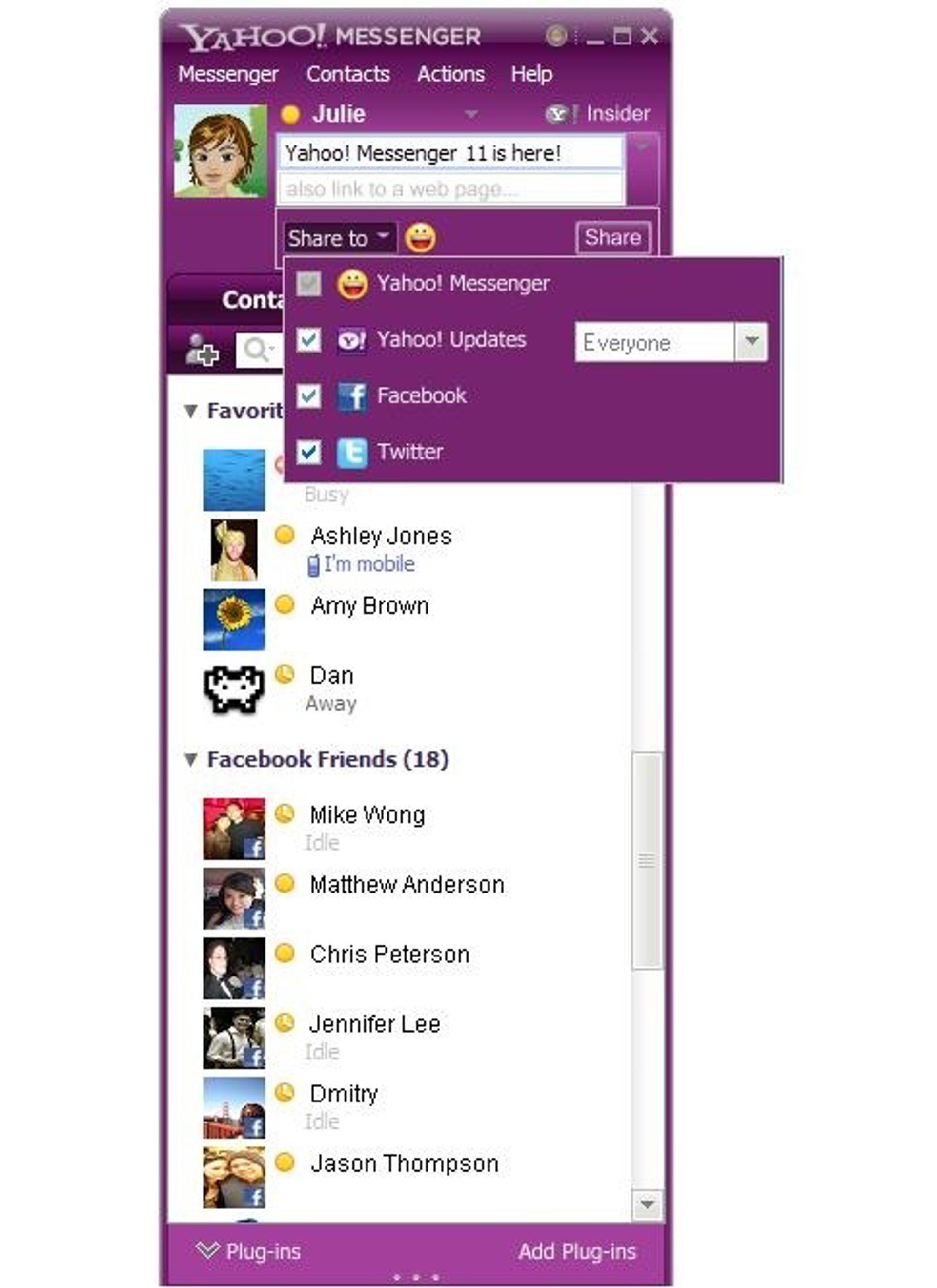 En adición a los clásicos servicios de mensajes de texto, voz y videollamadas, el programa incluye widgets de Facebook, Pulse, Flickr, o Twitter, con los que los usuarios pueden concentrar su experiencia social con mayor agilidad. Con estas novedades, pueden compartir un estado en sus redes sociales al mismo tiempo.