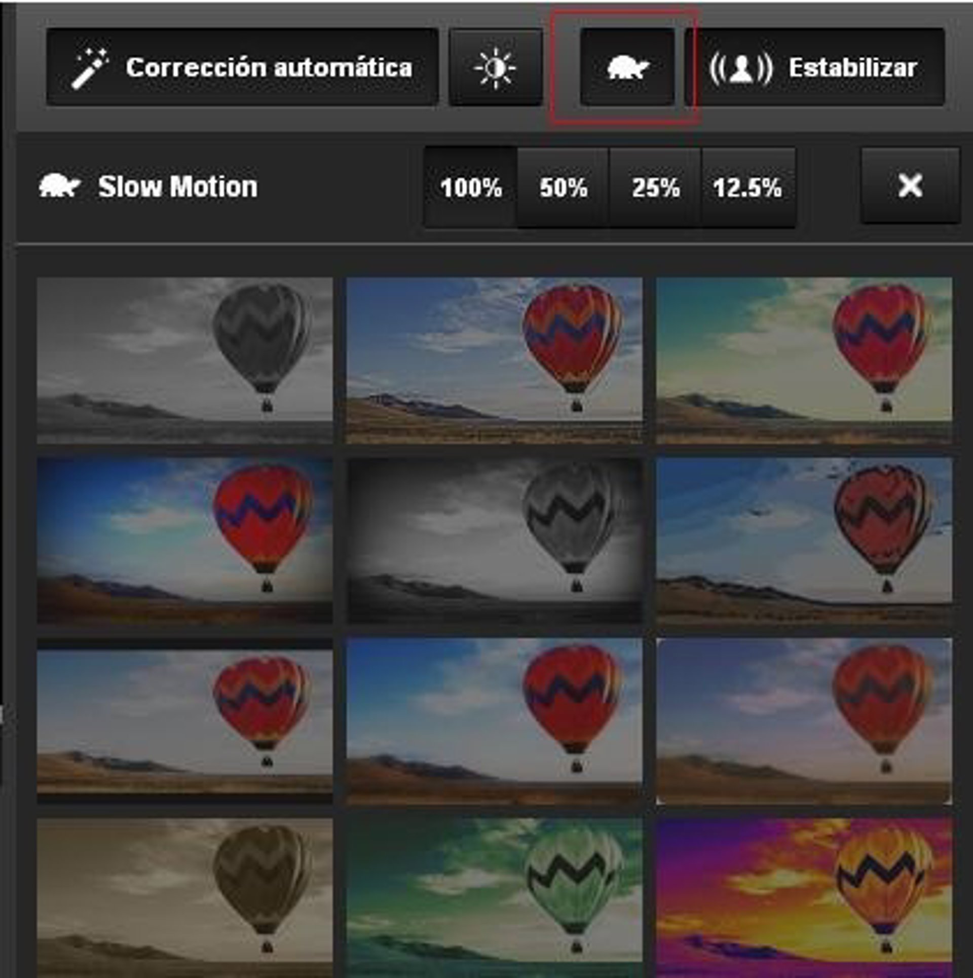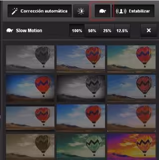 Al elegir uno de ellos, en la herramienta Mejoras (Enhancements, en inglés) además de la posibilidad de cambiar el color de la imagen, corregirla o estabilizarla aparece un nuevo botón con el icono de una tortuga. Ese icono es el que convierte todo el vídeo en cámara lenta. Incluso se podrá controlar la velocidad.