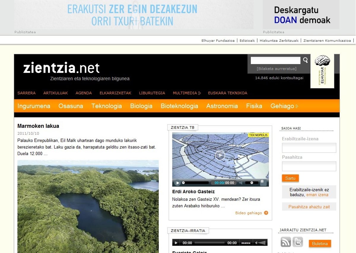 Zientzia.net recoge noticias sobre ciencia y tecnología y actualmente los usuarios podrán encontrar casi 15.000 contenidos en forma de artículos, vídeos y audios, divididos por temas como medioambiente, salud, tecnología, biología, biotecnología, astronomía o física.