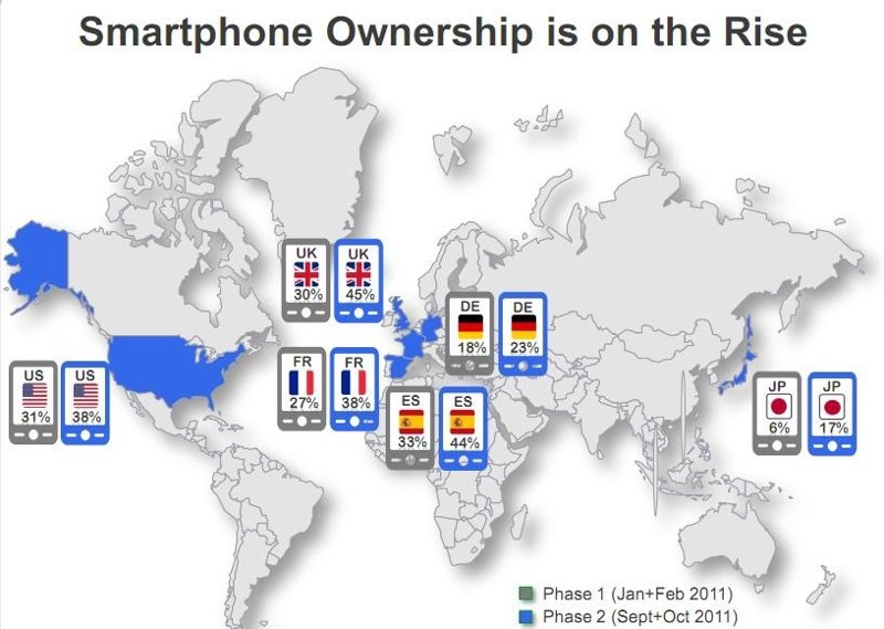 En tan sólo unos meses, se pasó de un 33 por ciento al 44 por ciento, convirtiéndose en la segunda más alta, por encima incluso de Estados Unidos, que ha tenido un incremento de un 8 por ciento frente al 11 por ciento español. De momento el país con más penetración de teléfonos inteligentes es Reino Unido, que tuvo un gran incremento en este último año, pasando de un 30 a un 45 por ciento.