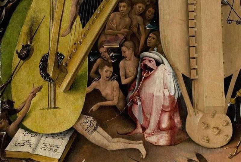 El cuadro del pintor holandés Hieronymus Bosch es un conjunto tres paneles abatibles que muestran escenas del jardín del Edén en su lado izquierdo, el jardín de las delicias en el centro y el infierno a la derecha. Es precisamente en el lado derecho donde los dos estudiantes encontraron la partitura.