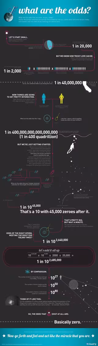 ¿Alguna vez te has preguntado qué probabilidades había de que fueses como eres, de que tuvieses ese pelo, esa altura o color de ojos? Es más: ¿Alguna vez te has preguntado qué probabilidades había de que llegases siquiera a existir?