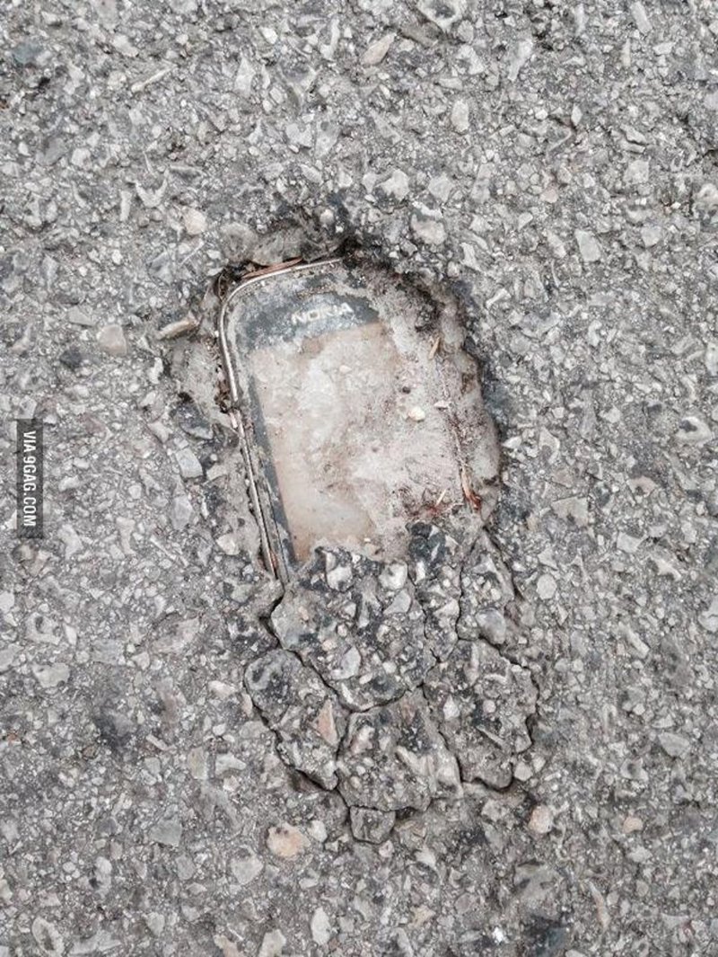 Ahora, un internauta ha compartido una fotografía en la que un Nokia aparece enterrado entre el asfalto de una carretera. Por supuesto, la reacción del resto de la comunidad 9gag ha sido hacer bromas, como que la vibración del teléfono estará provocando terremotos, que el mundo nació y está creciendo alrededor de este teléfono o que después de un rato en una fuente con arroz, seguiría funcionando.