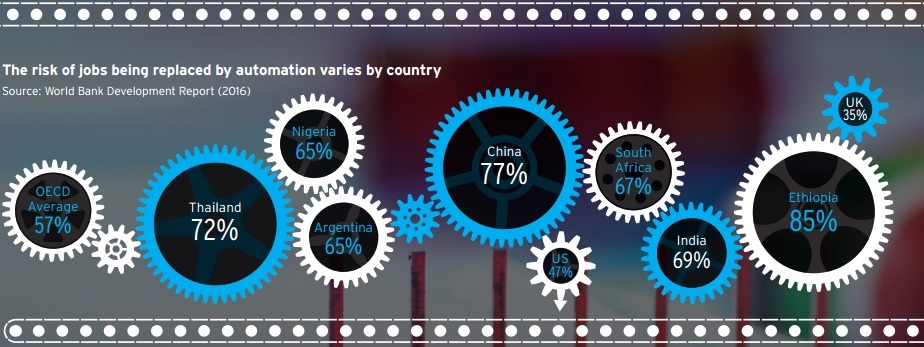 Basándose en datos ofrecidos por el Banco Mundial, este equipo de investigadores asegura que las probabilidades de que los robots tomen el control de los puestos de trabajo varían según los países. Así, afirman que el riesgo es más elevado en Etiopía (85 por ciento), China (77 por ciento) e India (69 por ciento) que en los países de la OCDE (57 por ciento, de media).