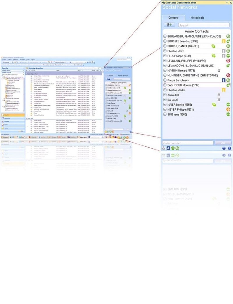 Los usuarios pueden ver en tiempo real información sobre la presencia de sus amigos, colaboradores, clientes y posibles contactos procedentes de diferentes fuentes: voz, correo electrónico, SMS, calendario de Outlook, mensajería instantánea y los canales de medios sociales más habituales: Facebook, Skype y Yahoo, para a continuación seleccionar el canal de comunicaciones más apropiado para contactar con ellos.