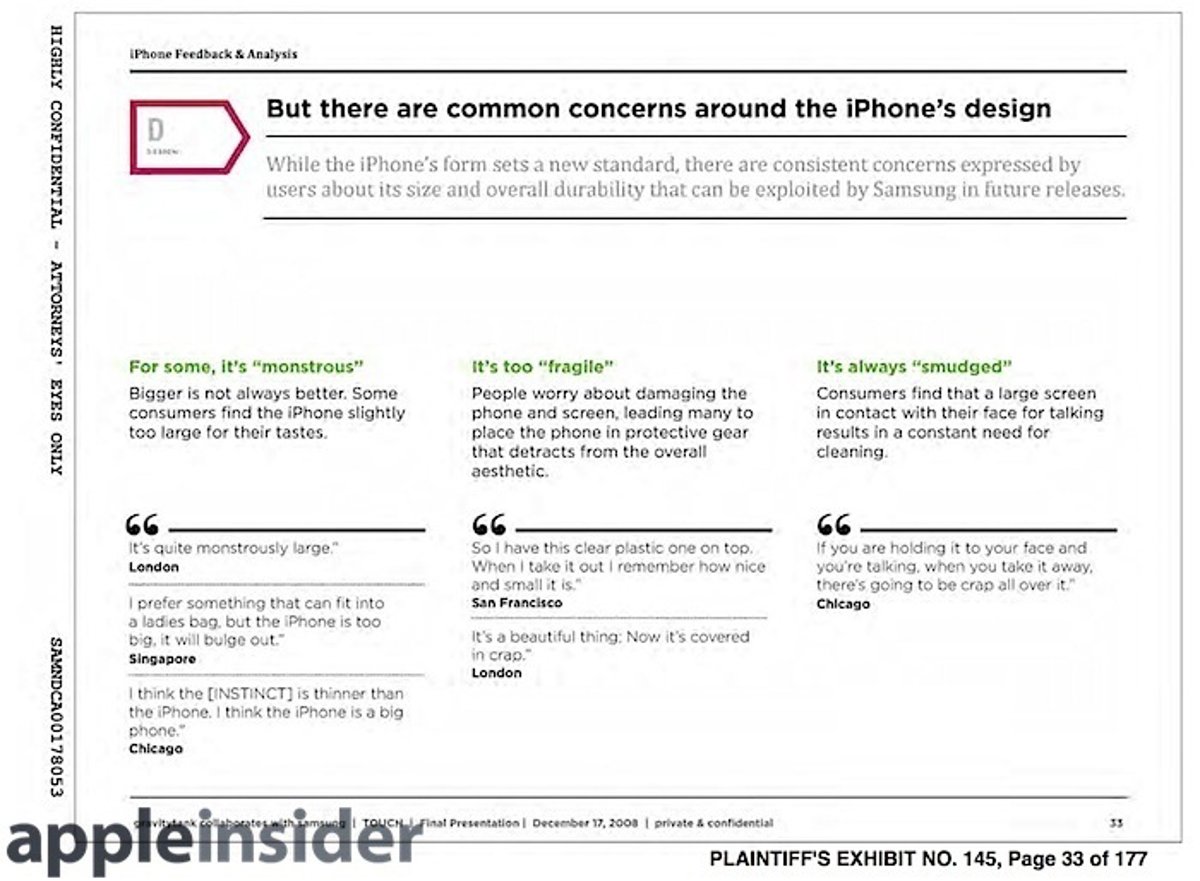 El juicio entre Samsung y Apple por las patentes ha dado numerosas sorpresas, entre ellas, un documento interno de Samsung que contiene lo que sería la estrategia a seguir en el diseño de sus dispositivos móviles a raíz del lanzamiento de iPhone 3G por parte de Apple. Mientras que los consumidores parecían preferir entonces terminales más pequeños, según encuestas realizadas por la compañía surcoreana, Apple inicio una moda que incrementaría notablemente el tamaño de las pantallas, como ha recogido Appleinsider en un completo reportaje.