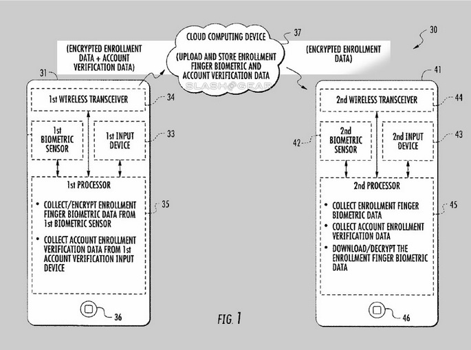Una vez se registra la huella a través del sensor del iPhone, los datos pasan, previa autorización, a una nube a través de un transceptor 'wirless'. Los datos, una vez en la nube, pasarían a encriptarse para que, cuando se soliciten a través de un nuevo dispositivo, se puedan descargar en él sin necesidad de volver a guardar la huella de forma manual. Lo que se almacena no es una imagen de la huella como tal, sino los datos biométricos de la misma, según informa Slash Gear, medio que ha tenido acceso a la patente y ha publicado la imagen que se muestra a continuación.
