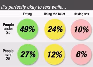 Según los resultados de un estudio elaborado por el portal Retrevo Gadgetology los menores de 25 años tienen menos reparos a la hora de contestar a un mensaje recibido en su móvil que los que superan esa edad. De hecho, uno de cada diez menores de 25 considera que es correcto enviar mensajes mientras practica sexo.