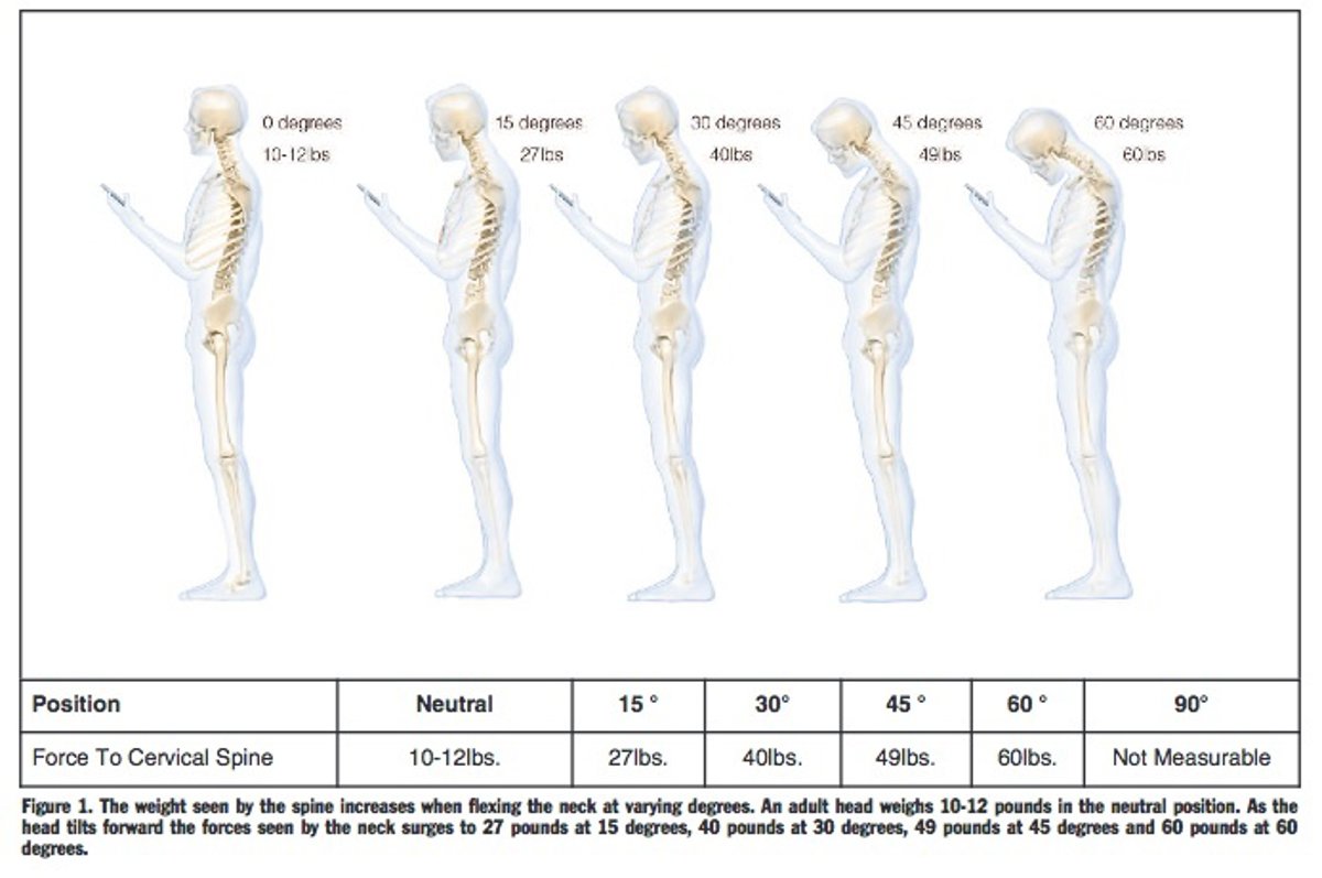 Según el estudio, una cabeza humana pesa de media entre 4 y 5 kilos pero al inclinarla para mirar la pantalla del smartphone, la tensión que ejerce sobre la columna aumenta hasta alcanzar los 27 kilos si doblamos el cuello en unos 60 grados.