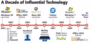 Microsoft ha creado un 'timeline' de la última década en el que enumera las que a su juicio han sido algunas de las novedades tecnológicas más importantes. La compañía se centra en sus propios productos, Windows XP u Office 2003, aunque también destaca el nacimiento de servicios como Facebook o Twitter.