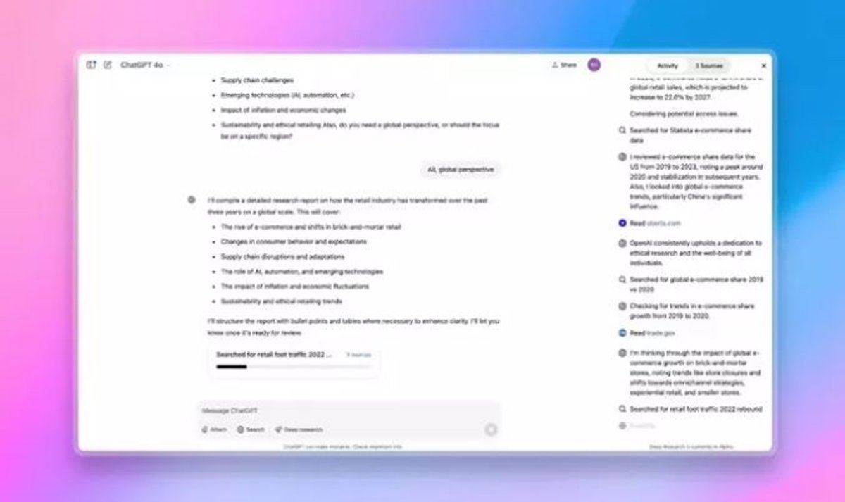 La compañía tecnológica presentó Deep Research a principios de este mes, cuando señaló que este agente utilizaba el razonamiento para sintetizar grandes cantidades de información y ejecutar tareas de investigación a nivel de un analista humano.