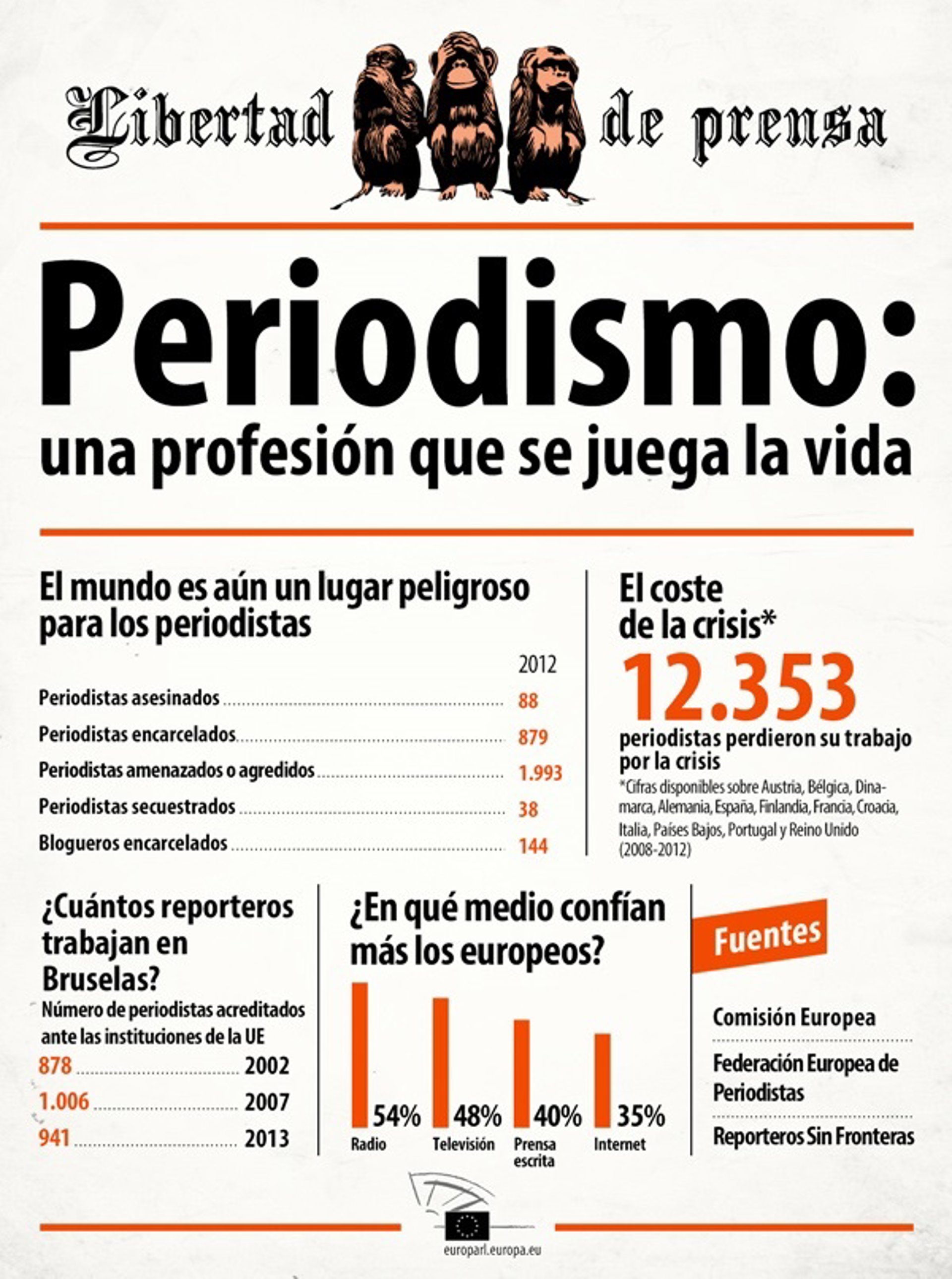 La Asamblea General de las Naciones Unidas, a iniciativa de los países miembros de la Unesco, proclamó en 1993 el 3 de mayo como Día Mundial de la Libertad de Prensa. La jornada se celebra este año con un panorama bastante negro para el Periodismo, con 12.353 profesionales que han perdido su puesto en Europa por la crisis y el nuevo panorama digital. Internet es el medio con menos credibilidad.