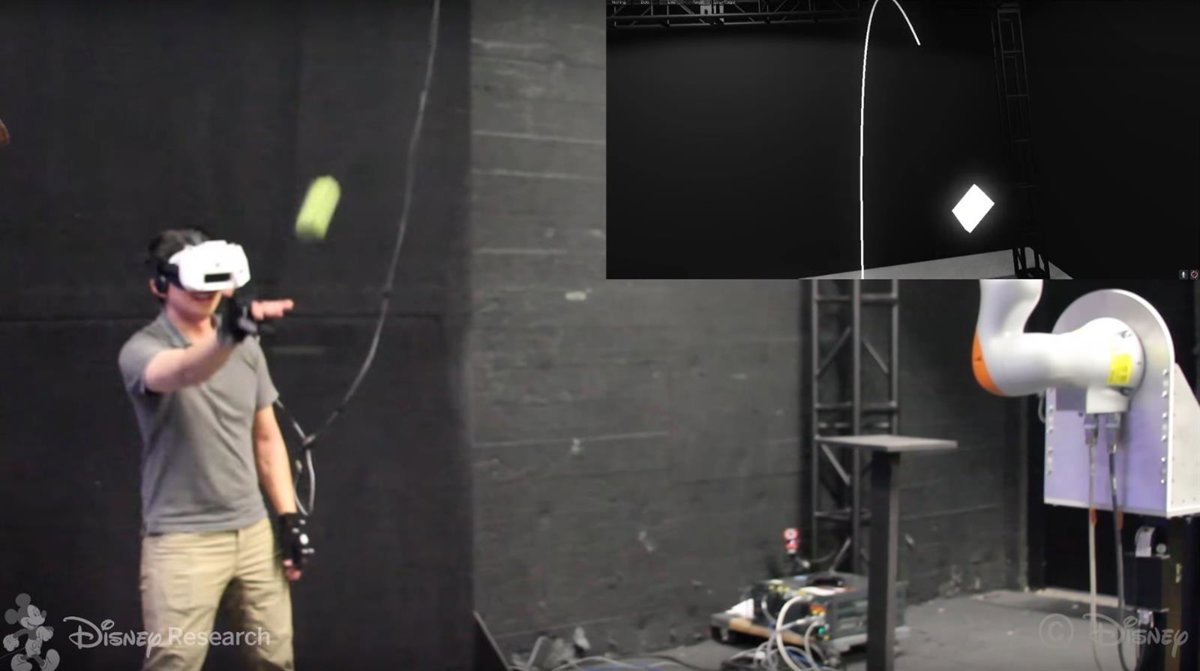 Investigadores de Disney Research han desarrollado un sistema que permite a un usuario de un casco de realidad virtual, dentro de un entorno virtual, coger con sus manos un balón real lanzado por otra persona.