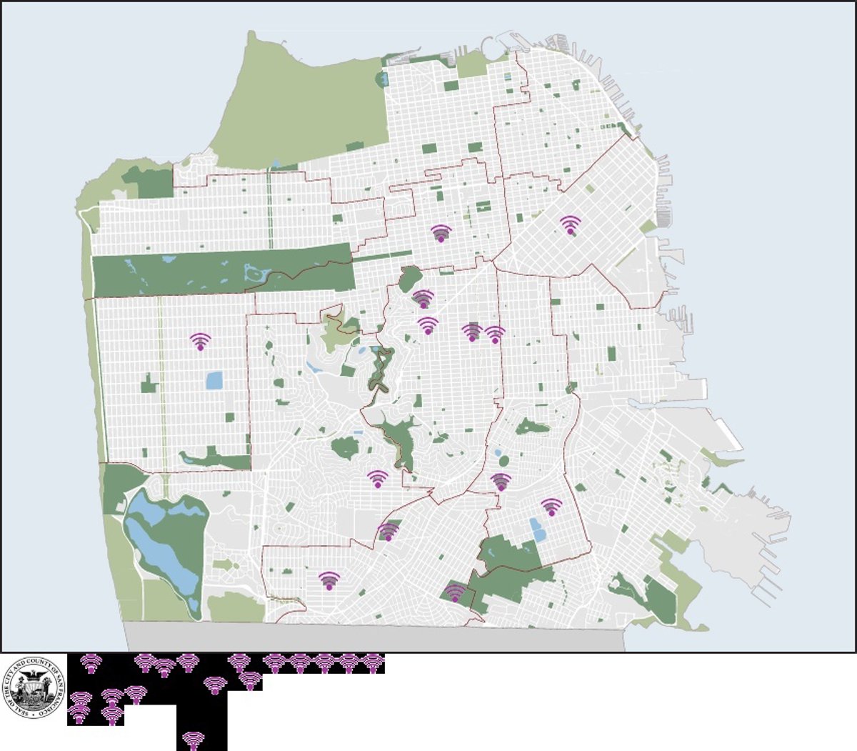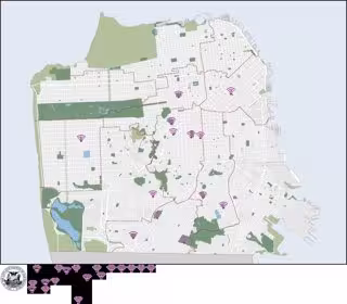 Algunos de los espacios públicos que tendrán acceso gratuito al WiFi según han informado en la Junta de Supervisores de la ciudad de San Francisco son: Alamo Square, Balboa Park, Chinese Recreation Center, Civic Center Plaza, Hamilton Recreation Center, Huntington Park, Margaret Hayward, Marina Green, St Mary's Square, Sunset Playground o Washington Square, entre otros.