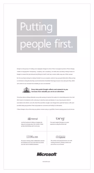 Tendrá un formato sencillo y directo y estarán enmarcados bajo el lema "las personas primero". El anuncio que ha mostrado Microsoft realiza en primer lugar una crítica a Google, y se resalta una frase que reza "Cada información que Google recoge sobre ti, aumenta su valor para un anunciante".