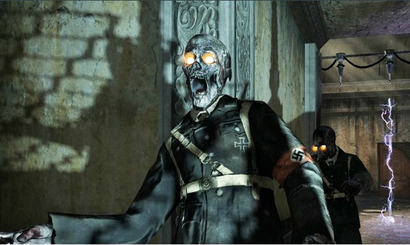 En el caso de Call of Duty, los zombis son los protagonistas en un modo de juego pero eso sí, con una particularidad: además de zombis son nazis (http://es.callofduty.wikia.com/wiki/Nazi_Zombies). El modo de juego consiste en que el jugador está encerrado en un escenario rodeado de infinitas oleadas de zombis. No hay nada mejor contra los zombis que una ración de plomo y este es el entrenamiento perfecto. ¿Puede haber un enemigo mejor que un zombi? Sí, un zombi con una esvástica en el brazo.