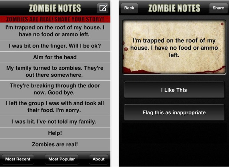 Por supuesto, también hay aplicaciones útiles cuya función es, como ocurre con el blog Apocalipsis Zombi, servir de guía en caso de que ocurra lo peor. Zombie Notes (http://itunes.apple.com/es/app/zombie-notes/id411541998?mt=8) permite publicar mensajes o dudas como si realmente viviésemos una invasión zombi. Una gran ayuda para irnos mentalizando.