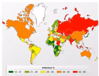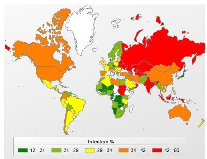 En relación al riesgo de infección según zonas geográficas, España se encuentra en un grupo intermedio, después de países como Rusia (59,5 por ciento) y Kazajstán (54 por ciento).
