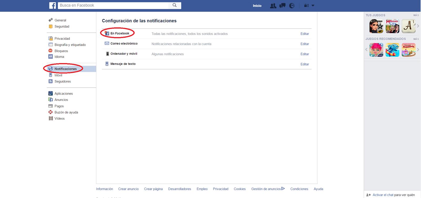 En el nuevo menú, verás que te sale información sobre configuración general de la cuenta en el centro de tu pantalla, acompañada por una serie de pestañas en la columna de la izquierda. En dicha columna pulsa en el nombre de “Notificaciones” y, dentro de esas opciones, haz clic en “En Facebook”.
