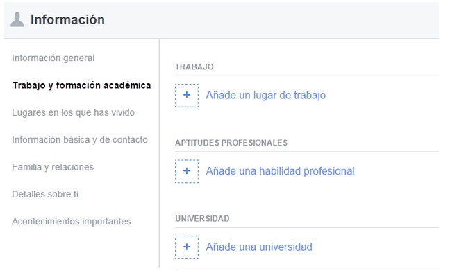 Puedes rastrear las diferentes secciones de tu perfil para añadir, editar o eliminar información. Esto es fundamental a la hora de dar una buena imagen de ti mismo. Todos hemos sido jóvenes y nos hemos creado Facebook sin pararnos a pensar en lo que compartíamos o cómo lo compartíamos, por lo que nunca está de más verificar que lo que tienes puesto es correcto y, sobre todo, que no hay nada que no quieras mostrar.