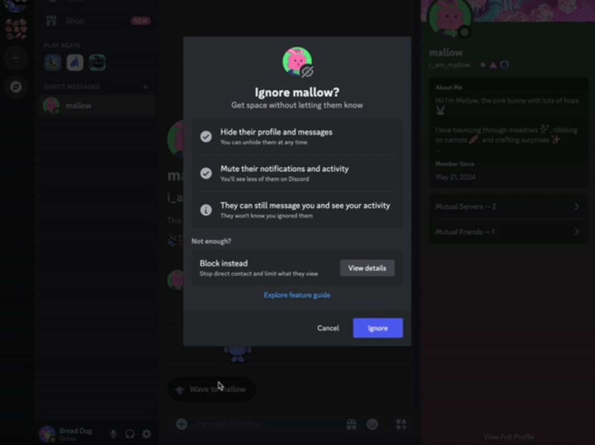 El botón que permite ignorar a alguien se encuentra en el menú desplegable del perfil de la persona y en los mensajes directos, y es una acción reversible. Discord recogerá en una lista, dentro de los 'Ajustes de usuario', todas aquellas que han sido ignoradas por el usuario, junto con las que ha bloqueado.