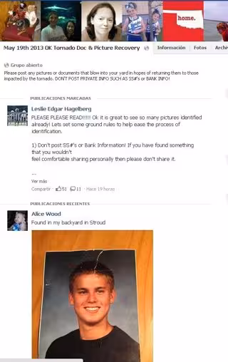 Un grupo de Facebook está ayudando a las víctimas del tornado de Oklahoma a recuperar sus pertenencias, mediante la subida de fotos de objetos perdidos que los usuarios vayan encontrando.