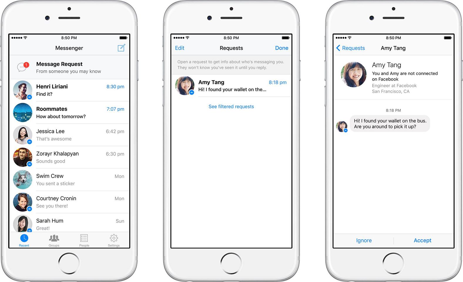 Facebook planea introducir una novedad para su aplicación Messenger relacionada con los mensajes de desconocidos, Message Request, la cual permitirá al usuario recibir o ignorar los escritos privados de gente fuera de su lista de amigos.