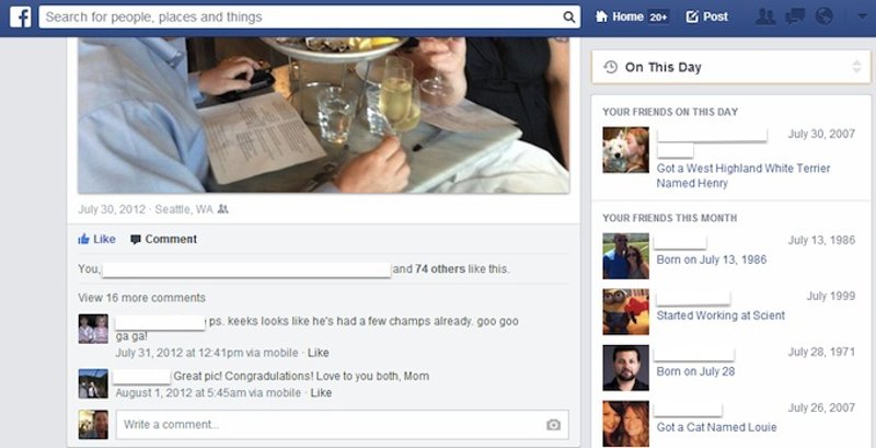 Una vez que esta herramienta se pone en marcha, Facebook crea una imagen de cabecera de alguno de los post de sus amigos en un día concreto, y al lado pone las propias noticias de hace un año del usuario.