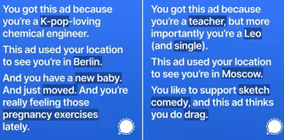 Las imágenes que iban a compartirse muestran unos ejemplos de textos personalizados que los usuarios iban a recibir. Uno de ellos indicaba: "Este anuncio te ha llegado porque eres un ingeniero químico al que le gusta el K-Pop. Este anuncio ha utilizado tu localización para ver que estás en Berlín. Y tienes un nuevo bebé. Y te acabas de mudar".