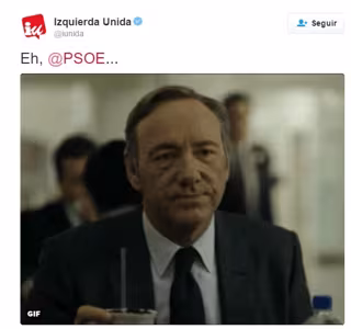 El detonante de esta "batalla" ha sido una captura de pantalla que la cuenta de IU ha compartido este lunes como una forma de intentar evidenciar que los socialistas en las redes sociales usan bots, que remiten el mismo mensaje y el posterior GIF, protagonizado por Kevin Spacey, en House of Cards.