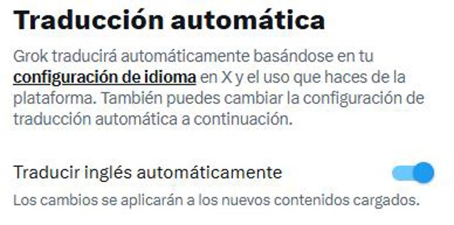 Una vez se haya pulsado sobre el engranaje, aparecerá el mensaje: "Grok traducirá automáticamente basándose en tu configuración de idioma en X y el uso que haces de la plataforma. También puedes cambiar la configuración de traducción automática a continuación", junto a un botón que permite desactivar la traducción.