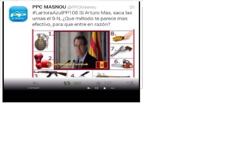 El último ejemplo de polémica en la red de microblogs se ha producido a raíz de una imagen compartida en la cuenta oficial del Partido Popular de Masnou. En concreto, en la cuenta de Twitter del partido político se compartía una imagen que incitaba a la violencia contra Arturt Mas. La imagen mostraba a Arturt Mas rodeado de armas y preguntaba sobre la mejor de todas ellas para actuar en caso de que finalmente se realice la consulta soberanista planteada por el presidente de Cataluña.