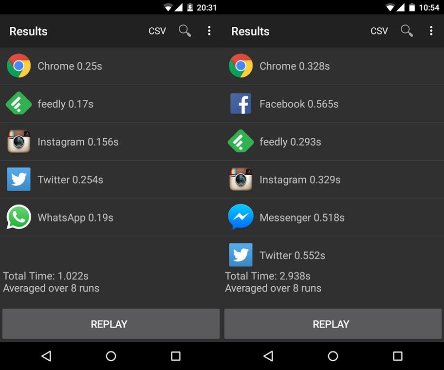 Eso sí, evidentemente se trata de una simulación en un entorno mucho menor que el real, por lo que hay que evaluar los resultados en su magnitud. Las capturas adjuntas muestran los resultados y, efectivamente, el aumento en el tiempo de apertura de cualquier aplicación es generalizado cuando está presente Facebook, y aumenta considerablemente con cada nueva iteración.