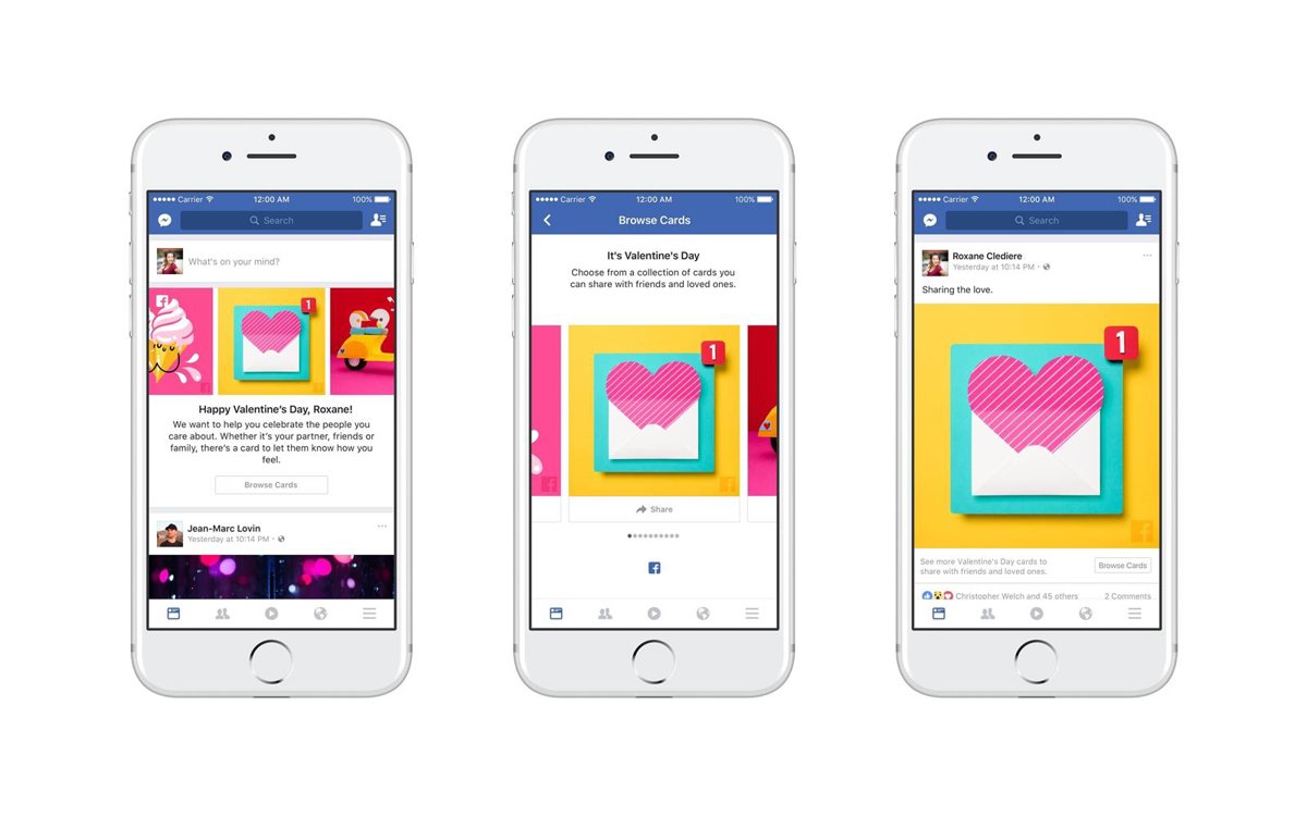 Para celebrar San Valentín, Facebook ha lanzado este lunes 13 de febrero unas tarjetas virtuales especiales que permiten a sus usuarios felicitar a sus amigos y familiares a través de la red social. Estas postales animadas, que cuentan con diez diseños creados por artistas locales de Nueva York y Londres, estarán disponibles solamente hasta el final del día 14 de febrero.